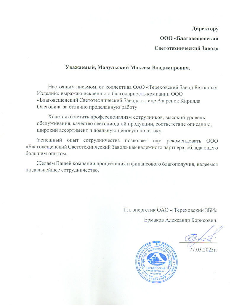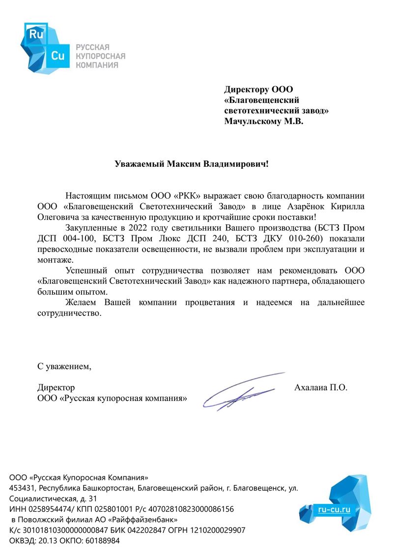| Наименование юридического лица | ООО «БЛАГОВЕЩЕНСКИЙ СВЕТОТЕХНИЧЕСКИЙ ЗАВОД» |