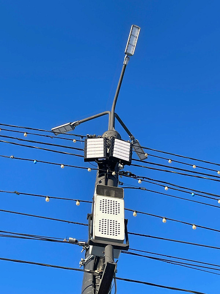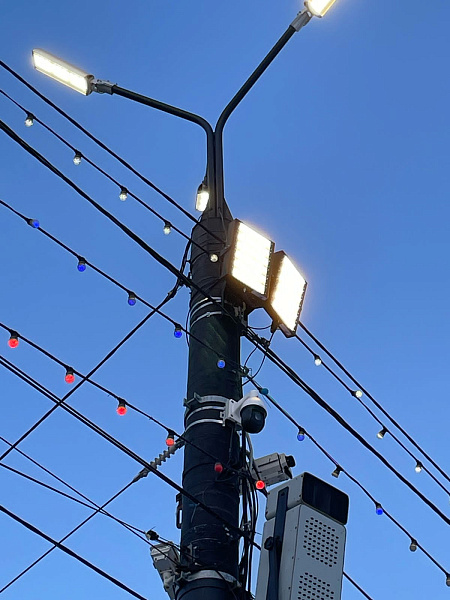 Освещение равномерное и комфортное для глаз, без темных зон и слепящего эффекта. Прожекторы расположены таким образом, что освещают всю площадь, а их высота установки предотвращает ослепление прохожих. Мощность прожекторов выбрана оптимально, не создавая избыточного освещения и обеспечивая достаточную яркость.